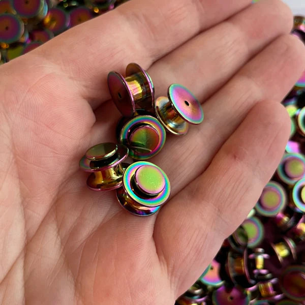 These premium, rainbow anodized, locking pin backs are the perfect solution for all your shoe flair needs.